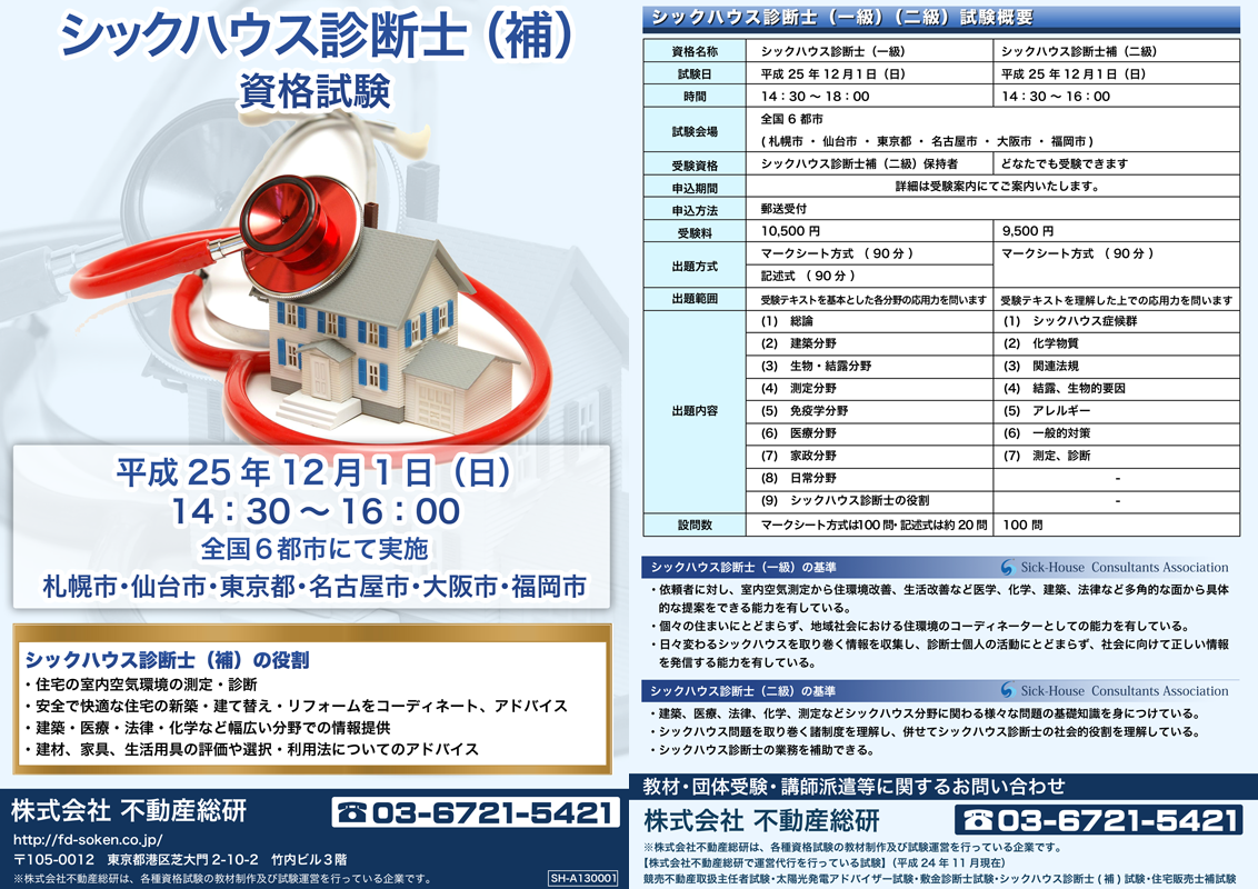 シックハウス診断士とは、シックハウス症候群についての幅広い知識を身につけ、シックハウス症候群に悩まされている方の住宅の調査、室内空気環境の測定などを行い、専門家としてのアドバイスをします。